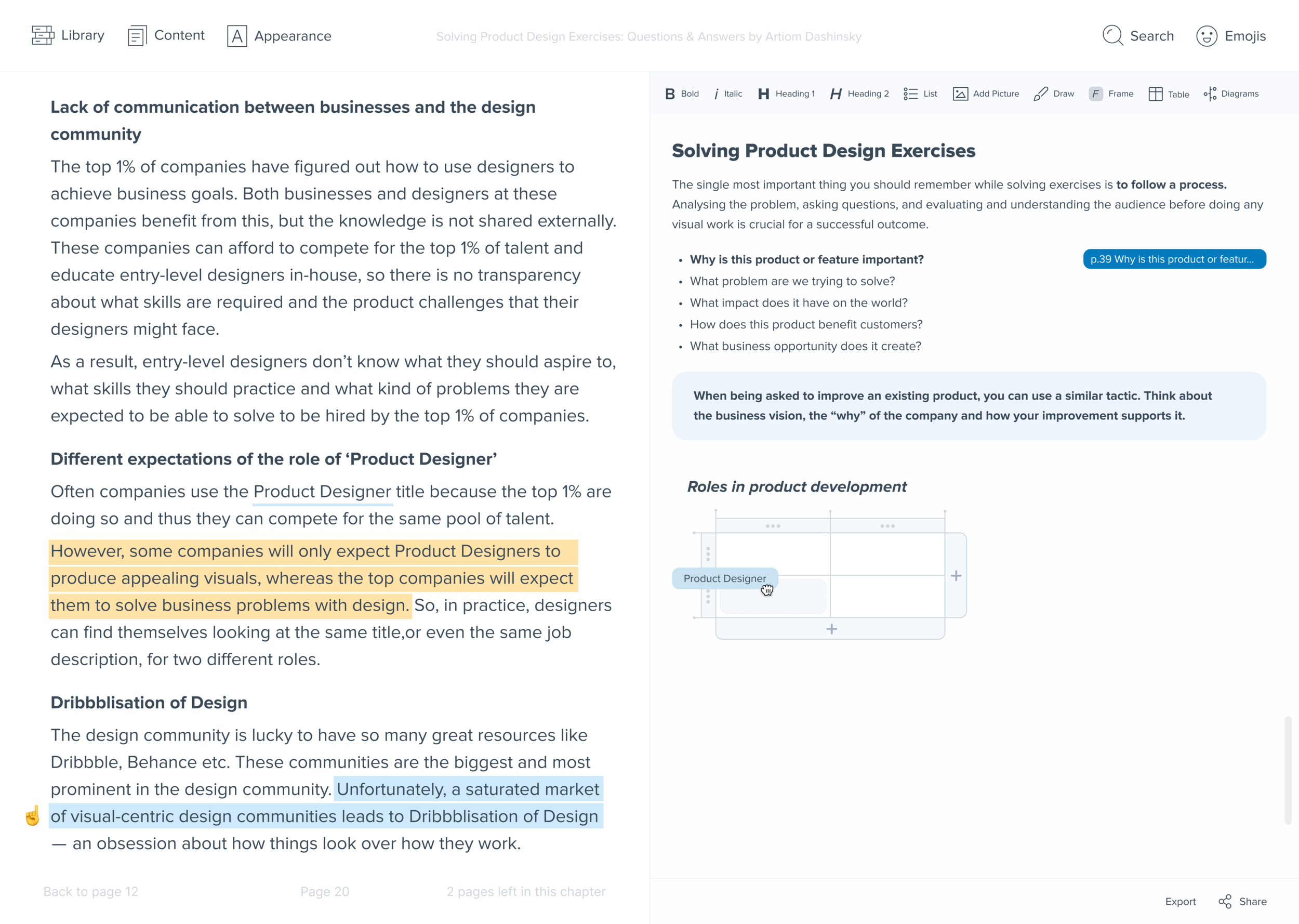 Reading & note-taking mode: text is on the left side, and notes are on the right side. Notes contain anchor tags, which are connected to the sentences in the text. They have different colours codings according to the highlights in the text. In addition, readers can add an emotional reaction to the piece of text or a note by including an emoji.