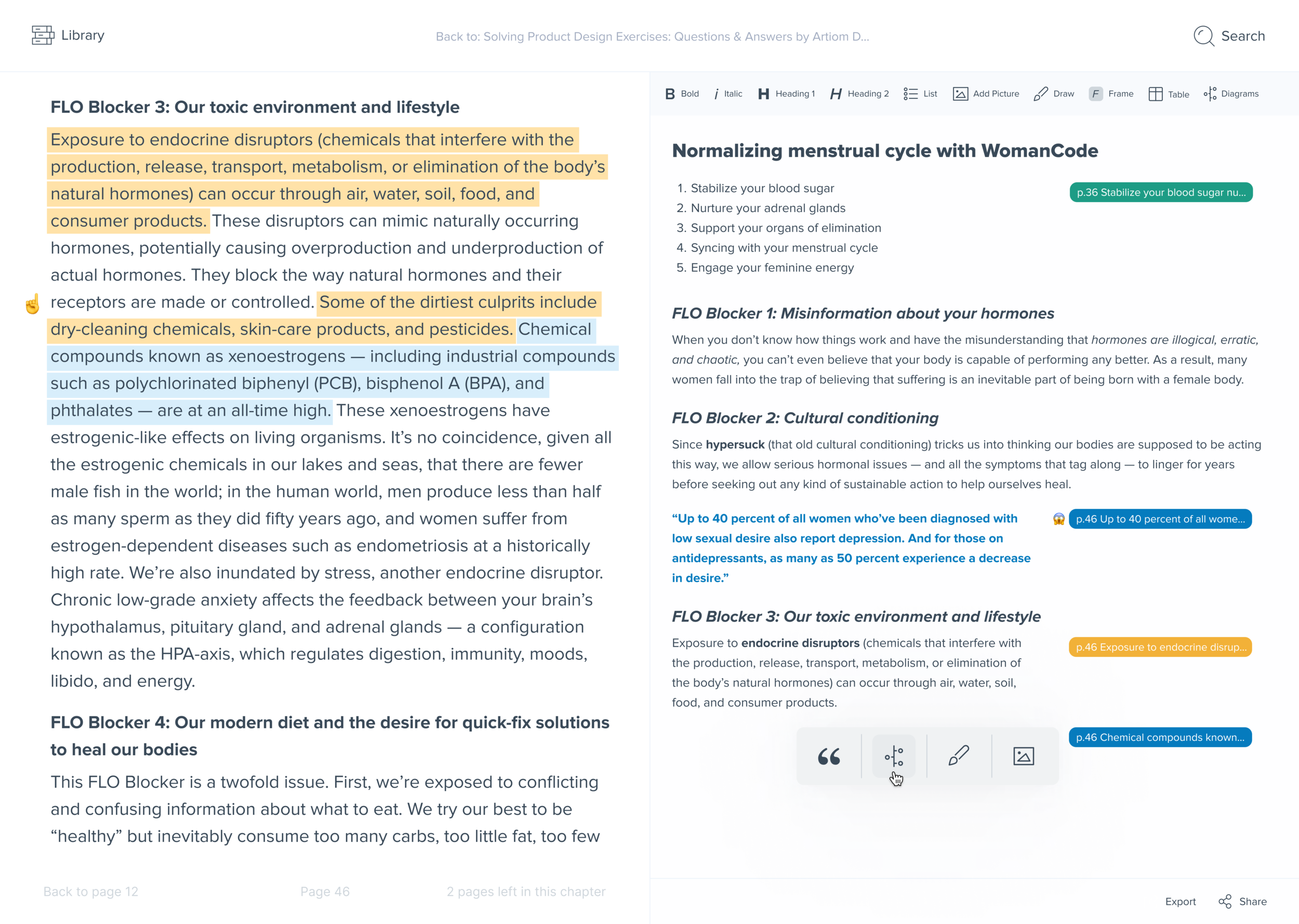Reading & note-taking mode: Users can use both linear (lists and texts) and non-linear (mind-maps, loop diagrams, timelines and tables). Every note is connected to a word or a sentence in the text by an anchor tag with a page number. By clicking on the anchor tag, a reader comes back to the highlighted part in the text.
